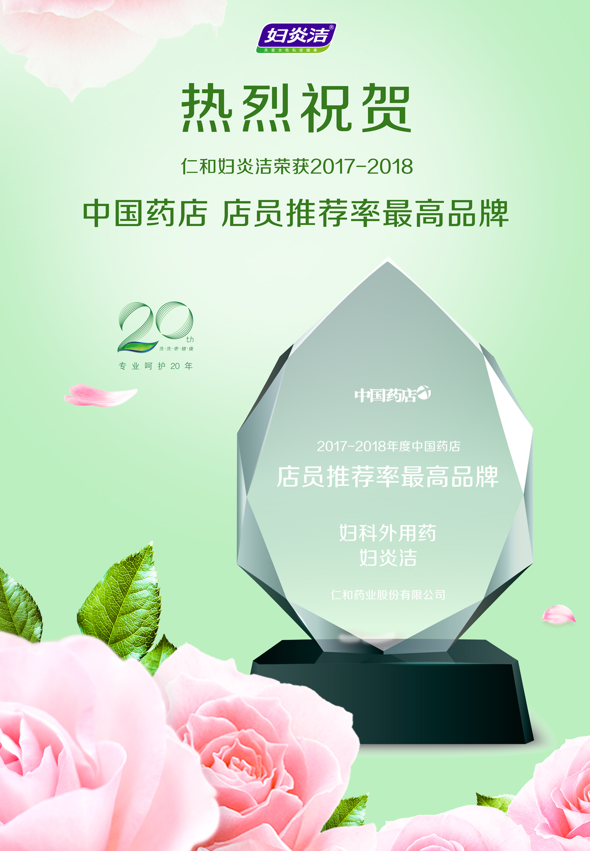当晚举行了“2017-2018中国药店店员推荐率最高品牌”颁奖礼,仁和药业旗下女性洗液领导品牌“妇炎洁”以过硬的产品质量、良好的口碑以及颇具影响力的品牌价值,再次榜上有名,荣获妇科外用药2017-2018中国药店店员推荐率最高品牌。