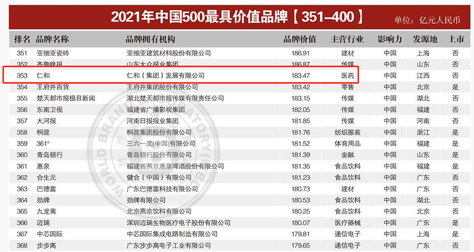 仁和品牌连续十五年入选中国500最具价值品牌榜 发布时间: 2021年07月01日 11:08:48 阅读量: 8,985 由世界品牌实验室(World Brand Lab)主办的(第十八届)“世界品牌大会”于2021年6月22日在北京举行,会上发布了2021年《中国500最具价值品牌》分析报告。“仁和”以183.47亿元人民币品牌价值位列榜单第353位,品牌价值较去年增长近30亿元。这是仁和品牌连续十五年入选“中国500最具价值品牌”榜。 2021年是国家“十四五”规划开局之年,也是仁和“五五规划”起步之年。作为品牌强企的代表,仁和企业立足健康中国战略实施落地,通过创新改革、不懈奋斗,坚持“工商互”一体化发展,在传统医药、医药大健康、医药新零售等领域齐头并进,各项业务指标均保持行业领先水平发展速度,实现了高质量发展的瞩目成就。在资本市场,今年以来仁和市值不断攀升,前景可期。未来,仁和将持续坚持造品牌文化建设,坚守“为人类健康服务”初心理念和责任担当,以“百年仁和、千亿产业”为目标,努力打造中国领先的医药企业。 据了解,世界品牌实验室是全球最具权威的品牌价值研究机构之一,其研究成果已成为企业无形资产评估的重要依据之一?!吨泄?00最具价值品牌》分析报告采用“收益现值法”对品牌价值进行测评,基于经济适用法并综合消费者研究、竞争分析以及对企业未来收入的预测,已连续发布18年,是衡量中国品牌价值的重要风向标。 下一篇:稳步发展,铿锵有力 ——仁和集团再次入围江西民营企业百强前列上一篇:仁和登陆中国企业社会责任高峰论坛,荣获“2023环境、社会及治理(ESG)年度案例”奖